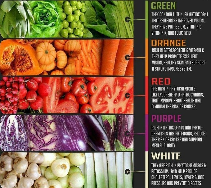 Since each category of vegetables give different nutrients and health benefits, it is important to consume different colors of vegetables everyday.